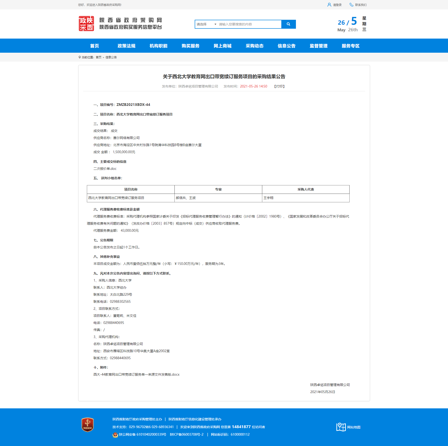 关于云博app官方在线入口教育网出口带宽续订服务项目的采购结果公告
