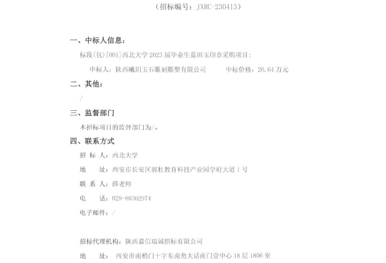 云博app官方在线入口2023届毕业生蓝田玉印章采购项目成交结果公告 作者: 编辑:采购与招标办公室 时间:2023-05-05 原公告链接:http://bulletin.sntba.com/resultBulletin/2023-05-05/554805.html