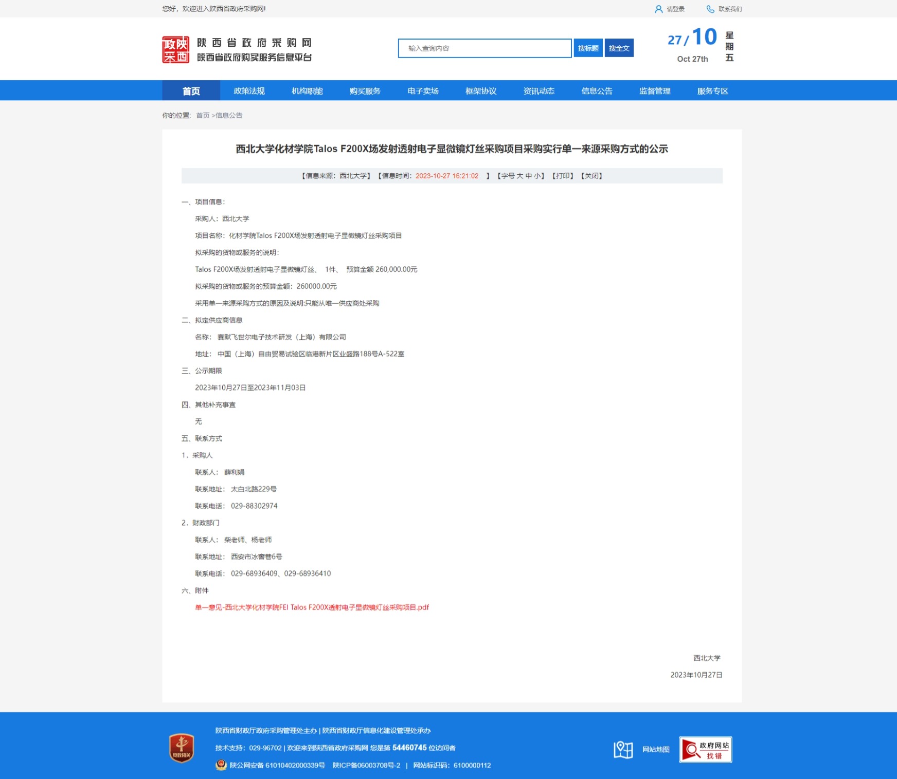 云博app官方在线入口化材学院Talos F200X场发射透射电子显微镜灯丝采购项目采购实行单一来源采购方式的公示 作者: 编辑:采购与招标办公室 时间:2023-10-27 原公告链接:http://www.ccgp-shaanxi.gov.cn/freecms/site/shaanxi/ggxx/info/2023/8a69c1288b6f04ea018b7035835c48ea.html?noticeType=001051¬iceId=11c24886-74a3-11ee-9a8e-08c0eb20c666