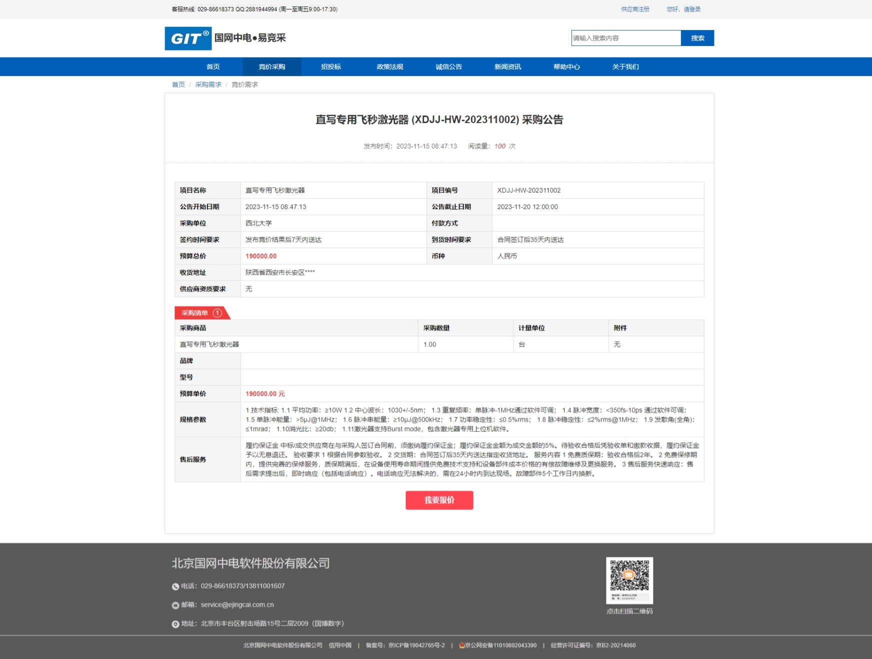 云博app官方在线入口直写专用飞秒激光器采购公告 作者: 编辑:采购与招标办公室 时间:2023-11-15 原公告链接:https://www.ejingcai.com.cn/site/bidding/detail/6692
