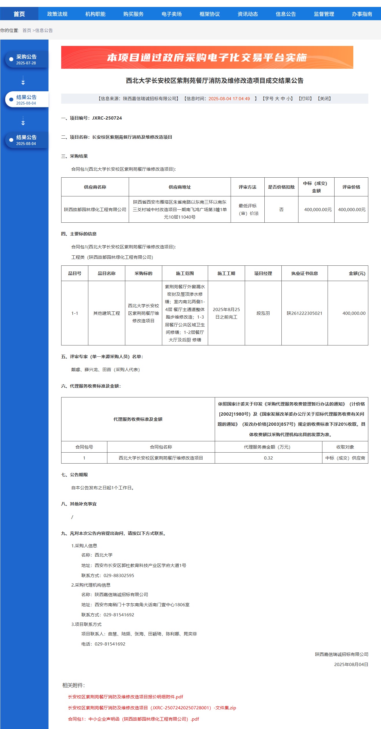 云博app官方在线入口长安校区紫荆苑餐厅消防及维修改造项目成交结果公告 作者: 编辑:党丹珩 时间:2025-08-04 公告地址:http://www.ccgp-shaanxi.gov.cn/freecms/site/shaanxi/ggxx/info/2025/8a69c4d59860f6420198744983276ed2.html?noticeType=001023¬iceId=1f58d820-7114-11f0-8063-08c0eb20c666