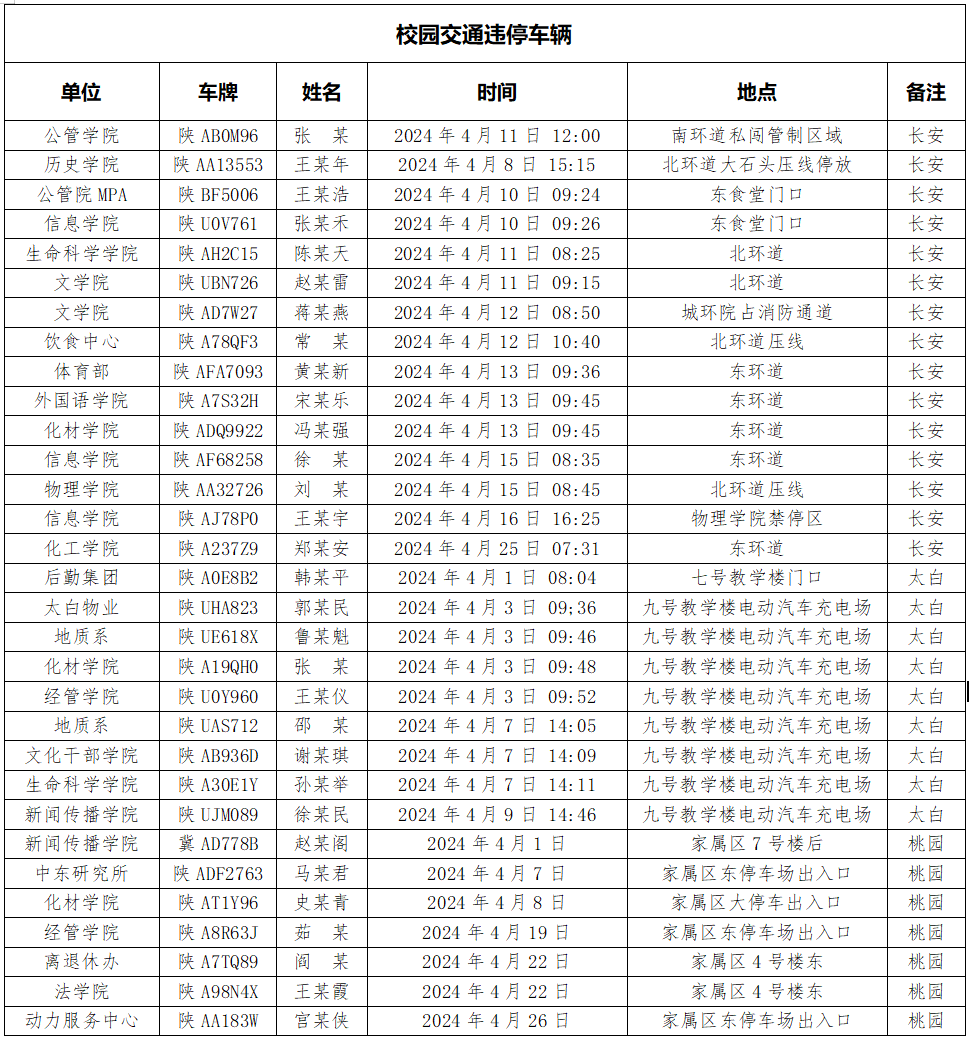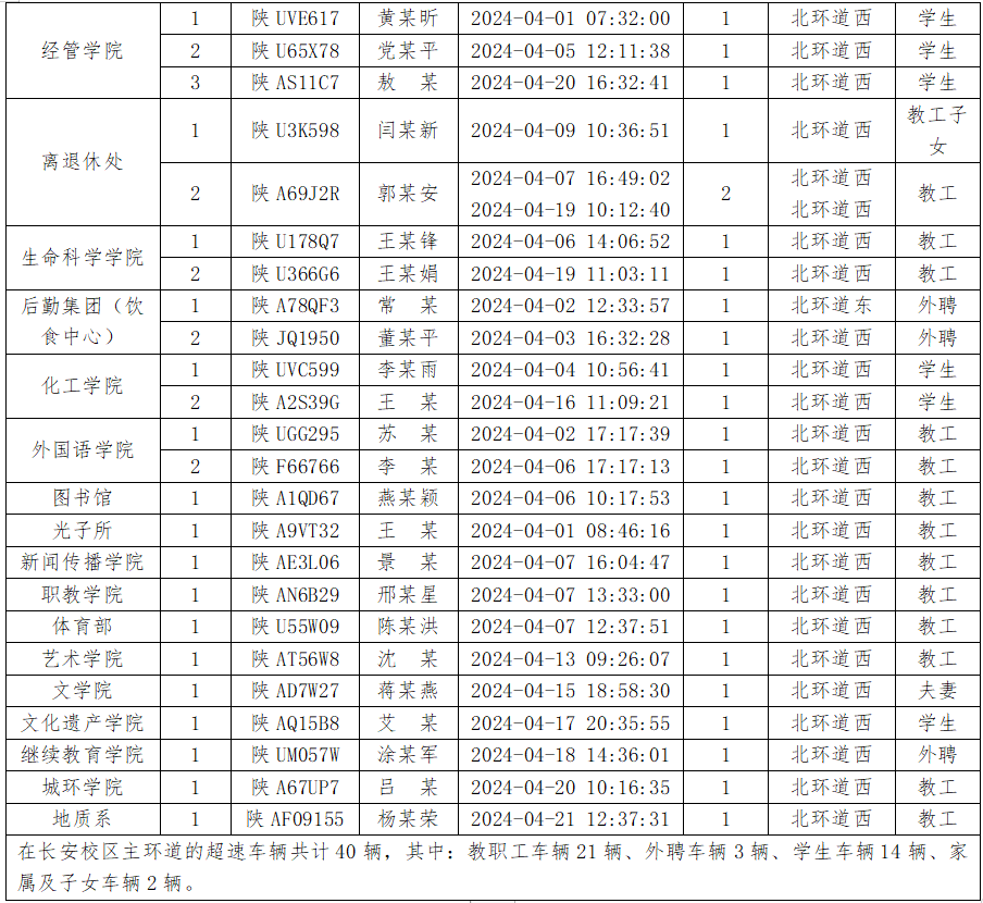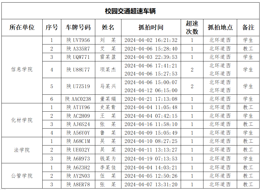 为加强校内道路交通安全管理,规范校内交通秩序,根据《云博app官方在线入口校园道路交通管理办法》有关要求,现将2024年4月校园交通违章车辆予以曝光,4月份教工超速车辆占52%、学生超速车辆占35%、外聘职工及教工家属车辆占12%,请所在单位加强对本单位违章师生员工的教育和管理,对于校内曝光超速的学生车辆将取消下一年度的通行证办理资格。