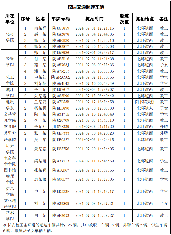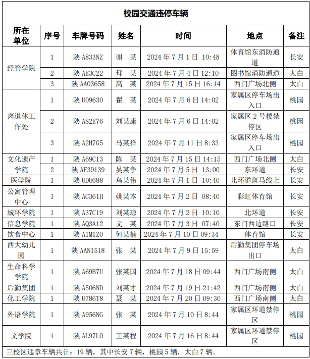 为一步加强校园交通管理,保障校园交通安全有序,维护学校正常的教学、科研和生活秩序以及师生员工的人身财产安全,根据《云博app官方在线入口校园交通安全管理规定》有关要求, 现将2024年7月校园交通违章车辆予以曝光,具体情况如下表。