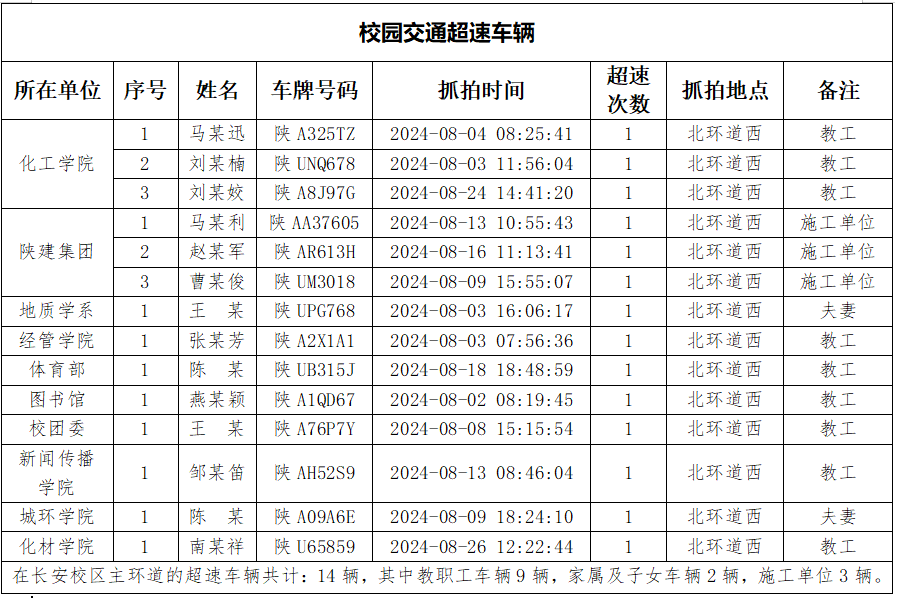 为一步加强校园交通管理,保障校园交通安全有序,维护学校正常的教学、科研和生活秩序以及师生员工的人身财产安全,根据《云博app官方在线入口校园交通安全管理规定》有关要求, 现将2024年8月校园交通违章车辆予以曝光,具体情况如下表。