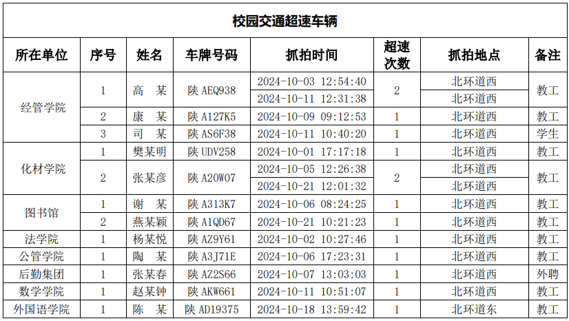 为进一步加强校园交通管理,保障校园交通安全有序,维护学校正常的教学、科研和生活秩序以及师生员工的人身财产安全,根据《云博app官方在线入口校园交通安全管理规定》有关要求, 现将2024年10月校园交通违章车辆予以曝光,具体情况如下表。