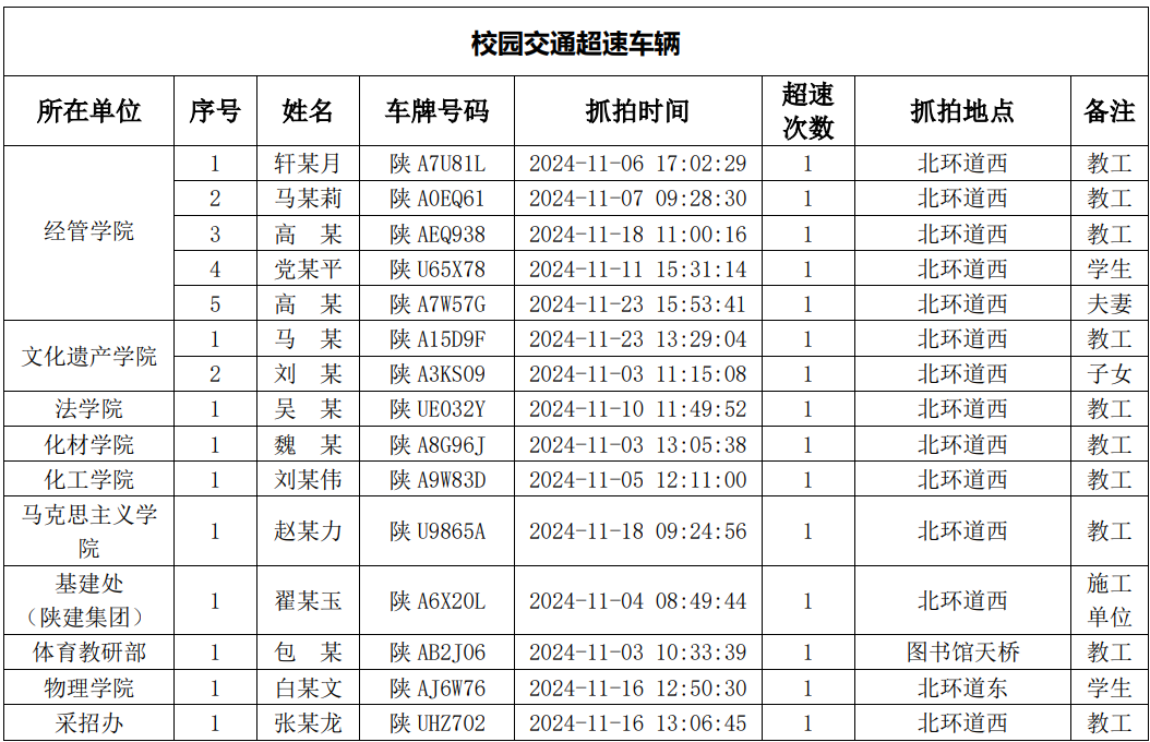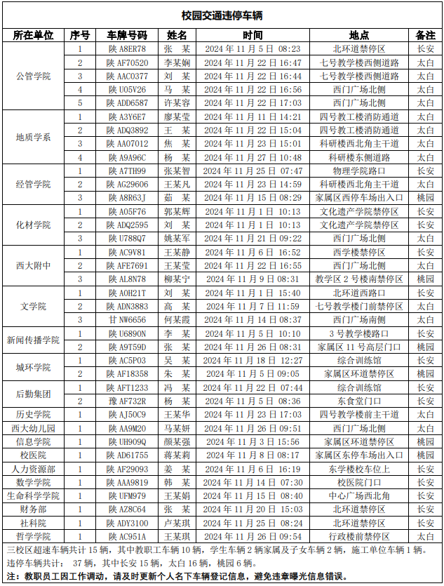 为进一步加强校园交通管理,保障校园交通安全有序,维护学校正常的教学、科研和生活秩序以及师生员工的人身财产安全,根据《云博app官方在线入口校园交通安全管理规定》有关要求, 现将2024年11月校园交通违章车辆予以曝光,具体情况如下表。