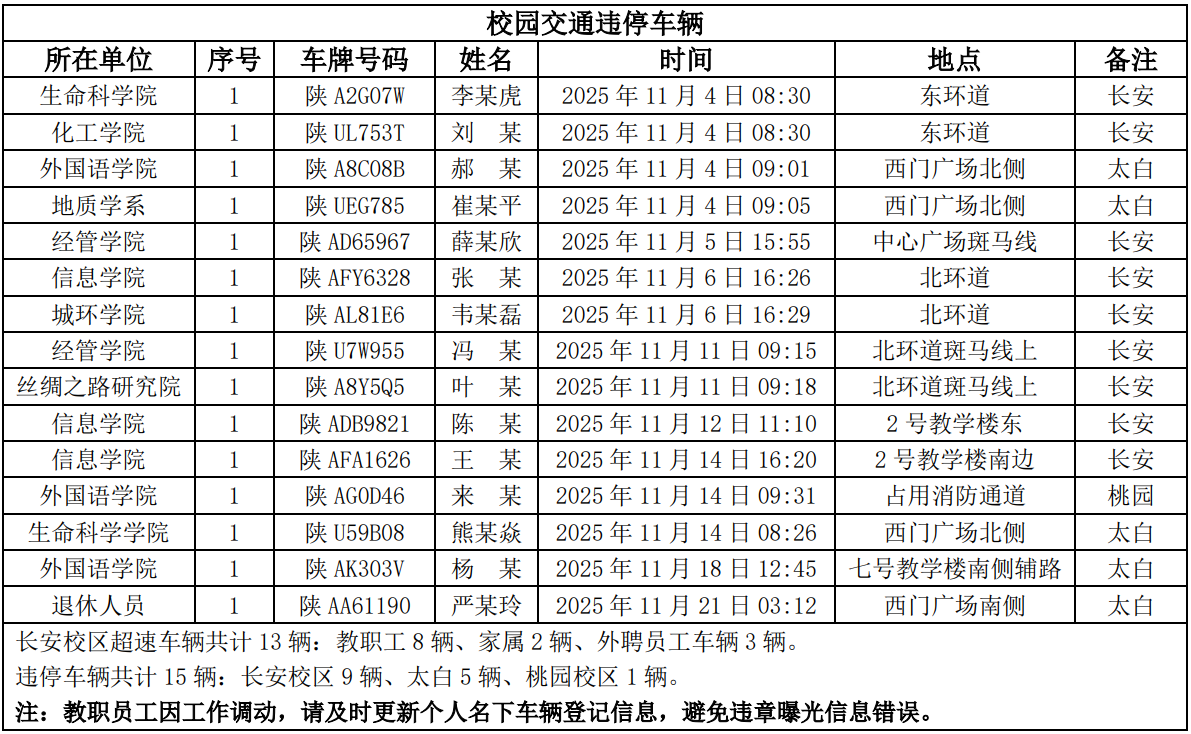 为进一步加强校园交通管理,保障校园交通安全有序,维护学校正常的教学、科研和生活秩序,切实保护师生员工的人身财产安全,根据《云博app官方在线入口校园交通安全管理规定》的相关要求,现将2025年11月校园交通违章车辆予以曝光,具体要求与违章信息如下: