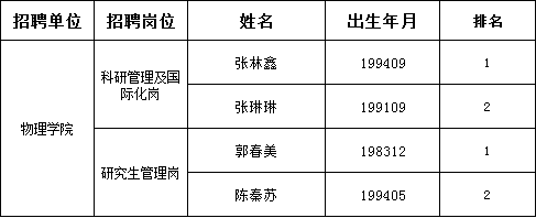 物理学院公开招聘B类人事代理人员结果公示 作者: 编辑: 时间:2019-06-13 09:18 根据《云博app官方在线入口物理学院公开招聘管理人员公告》的工作安排,经自主报名、资格审核、初试和复试环节,现将拟录用人员名单公示如下:公示时间:2019年6月13日至2019年6月15日。公示期内,如有异议,请以书面形式向云博app官方在线入口物理学院反映。联系电话:88303384。物理学院2019年6月13日