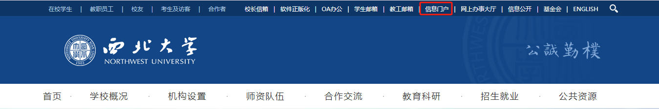 打开学校官方网站,点击云博(中国)“信息门户”入口,或通过域名“https://open.nwu.edu.cn/index”访问,输入统一身份认证账号(即学号或工号)和密码,即可进入信息门户系统。(温馨提醒:请妥善保管密码,以免因密码泄露导致个人信息安全问题)