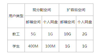校园网邮箱服务是云博app官方在线入口信息化建设的重要应用,也是云博app官方在线入口师生的重要通讯平台。为了更好的满足云博app官方在线入口师生在教学、办公、科研和学习中对邮箱服务和文档存储的需求,提供更好的服务,现代教育技术中心对校园网邮箱存储空间进行了扩容,具体空间分配情况如下: