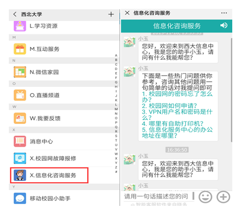 第二步:在“云博app官方在线入口”微信企业号中点击“X.信息化咨询服务”,信息化智能客服小玉将为您解答信息化服务问题。
