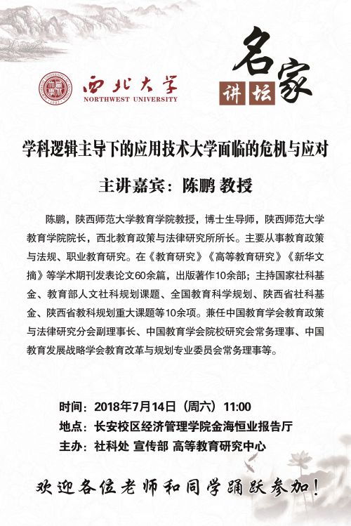 关于举办"名家讲坛"暨"高等教育论坛"(第十四期)的通知 作者: 编辑: 时间:2018-07-12 11:50 校内各有关单位:云博app官方在线入口名家讲坛暨高等教育论坛(第十四期)即将举行,现将具体情况通知如下:讲座题目:学科逻辑主导下的应用技术大学面临的危机与应对主讲嘉宾:陈 鹏 教授讲座时间:7月14日(周六)11:00讲座地点:云博app官方在线入口长安校区经济管理学院金海恒业报告厅主办单位:社科处、宣传部、高等教育研究中心欢迎各位老师和同学踊跃参加!