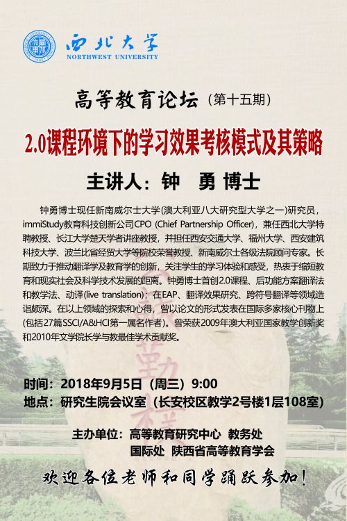云博app官方在线入口"高等教育论坛"(第十五期) 作者: 编辑: 时间:2018-09-03 16:59 校内各有关单位: “高等教育论坛”第十五期即将举行,现将具体情况通知如下: 讲座题目:2.0课程环境下的学习效果考核模式及其策略主讲嘉宾:钟 勇 博士讲座时间:2018年9月5日(周三)上午9:00讲座地点:研究生院会议室(长安校区教学2号楼1层108室)主办单位:高等教育研究中心、教务处、国际处、陕西省高等教育学会欢迎各位老师和同学踊跃参加!窗体顶端联系人:伍小东 13891830894