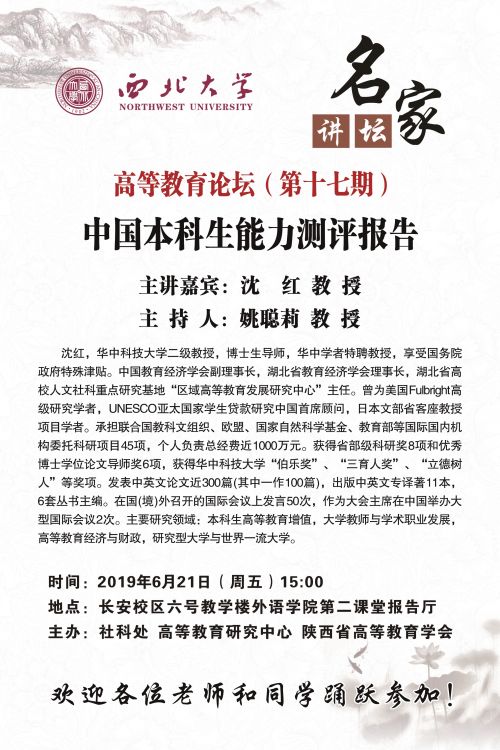 关于举办"名家讲坛"暨"高等教育论坛"(第十七期)的通知 作者: 编辑: 时间:2019-06-19 10:43 校内各有关单位:云博app官方在线入口名家讲坛暨高等教育论坛(第十七期)即将举行,现将具体情况通知如下:讲座题目:中国本科生能力测评报告主讲嘉宾:沈 红 教授讲座时间:6月21日(周五)15:00讲座地点:长安校区六号教学楼外语学院第二课堂报告厅主办单位:社科处、高等教育研究中心、陕西省高等教育学会欢迎各位老师和同学踊跃参加!