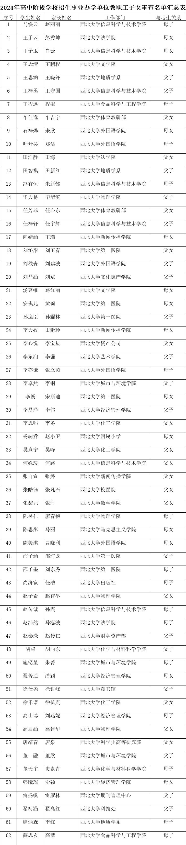 关于2024年高中阶段学校招生云博app官方在线入口 正式事业编制的教职工直系初中应届毕业子女审查结果的公示 作者:附中 编辑:附中 时间:2024-05-13 根据市、区教育局通知及要求,云博app官方在线入口于2024年5月6日开展2024年高中阶段学校招生云博app官方在线入口正式事业编制的教职工直系初中应届毕业子女审查工作。经大学人力资源部门、纪检部门审核,通过名单如下(按学生姓氏笔画数排序): 现予以公示,公示时间为5月13日至5月19日。公示期内,如对公示名单有异议,可通过来电形式向云博app官方在线入口反映。 电 话:88363909 云博app官方在线入口附属中学 2024年5月13日