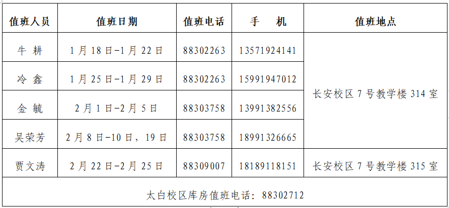 实验室建设与管理处2021年寒假值班安排 作者:实验室建设与管理处 编辑:牛耕 时间:2021-01-18 按照学校《关于2021年寒假放假的通知》安排和要求,现将我处寒假期间值班安排及联系方式公布如下: 一、值班要求 1. 值班时间:工作日9:00—11:30,14:30—17:00。(周六、周日、除夕至正月初七不安排值班) 2. 值班人员应保持通讯畅通,履行职责,做好记录和工作交接。 3. 请假期办理业务的老师严格遵守学校疫情防控有关规定,做好个人防护。 二、值班安排表 值班领导:李剑利 88309008 实验室建设与管理处 2021年1月18日