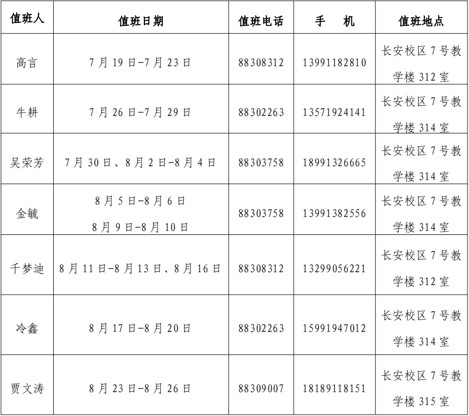 实验室建设与管理处2021年暑假值班安排 作者:实验室建设与管理处 编辑: 时间:2021-07-19 按照学校关于2021年暑假安排的通知,现将实验室建设与管理处暑假值班安排及联系方式安排如下: 一、值班要求 1. 值班时间:9:00—11:30,14:30—17:00。(周六、周日不安排值班)。 2. 值班人员应保持通讯畅通,履行职责,做好值班记录和工作交接。 3. 注意安全,做好办公室防火、防盗工作。 二、值班安排表 带班领导:李剑利 88309008 实验室建设与管理处 2021年7月19日