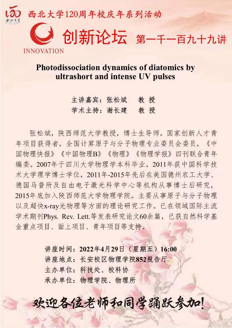 云博app官方在线入口创新论坛第一千一百九十九讲暨120周年校庆年系列活动:Photodissociation dynamics of diatomics by ultrashort and intense UV pulses 作者:张松斌 教授 编辑:杨钊 时间:2022-04-26