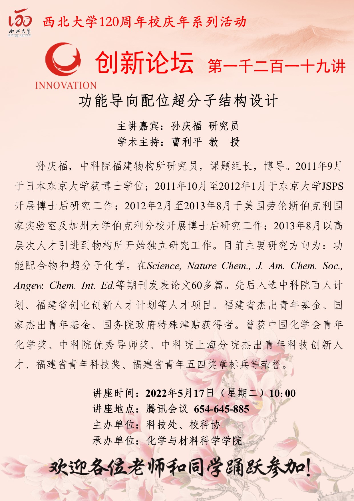 云博app官方在线入口创新论坛第一千二百二十讲暨120周年校庆年系列活动:杯芳烃—从大环受体到生物医用超分子材料