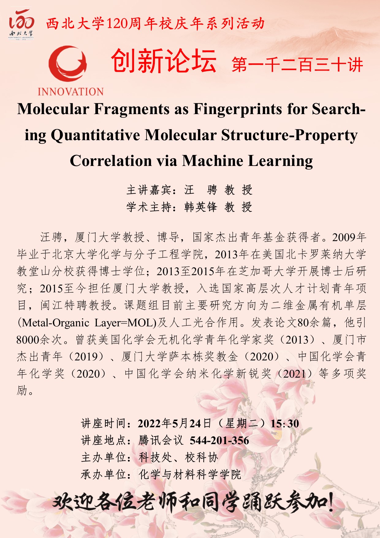 云博app官方在线入口创新论坛第一千二百三十讲暨120周年校庆年系列活动:Molecular Fragments as Fingerprints for Searching Quantitative Molecular Structure-Property Correlation via Machine Learning 作者:汪骋 教授 编辑: 时间:2022-05-23