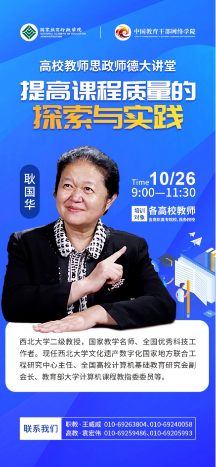 为学习贯彻落实党的二十大精神,以正确的政治方向和价值导向引领广大教师思想政治素质、师德素养和业务能力全面提升,国家教育行政学院中国教育干部网络学院将举办高校教师思政师德大讲堂,邀请云博app官方在线入口耿国华教授作题为《提高课程质量的探索与实践》的报告,欢迎云博app官方在线入口广大教师积极观看学习。