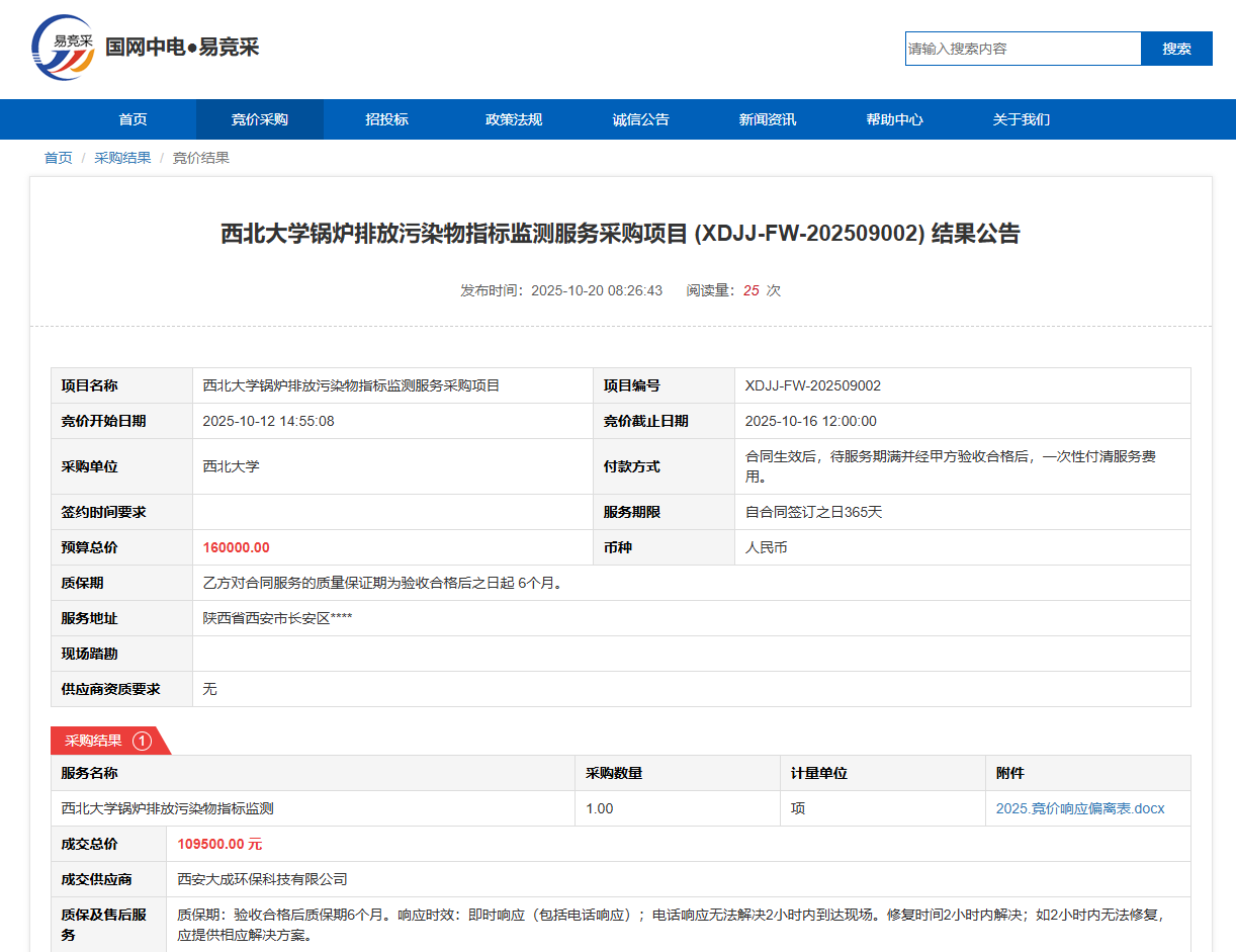 云博app官方在线入口锅炉排放污染物指标监测服务采购项目(XDJJ-FW-202509002)竞价结果公告