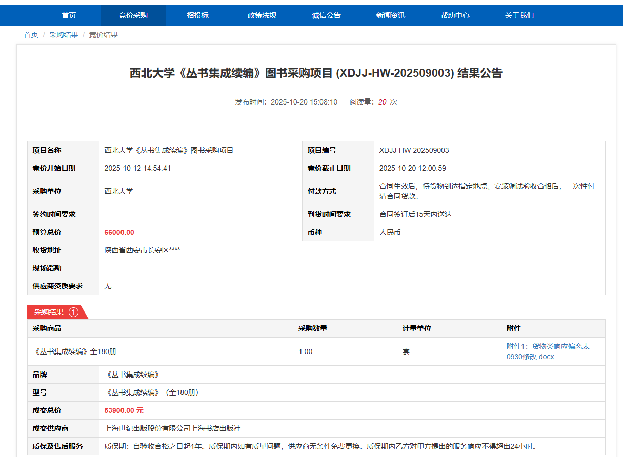 云博app官方在线入口《丛书集成续编》图书采购项目(XDJJ-HW-202509003)竞价结果公告