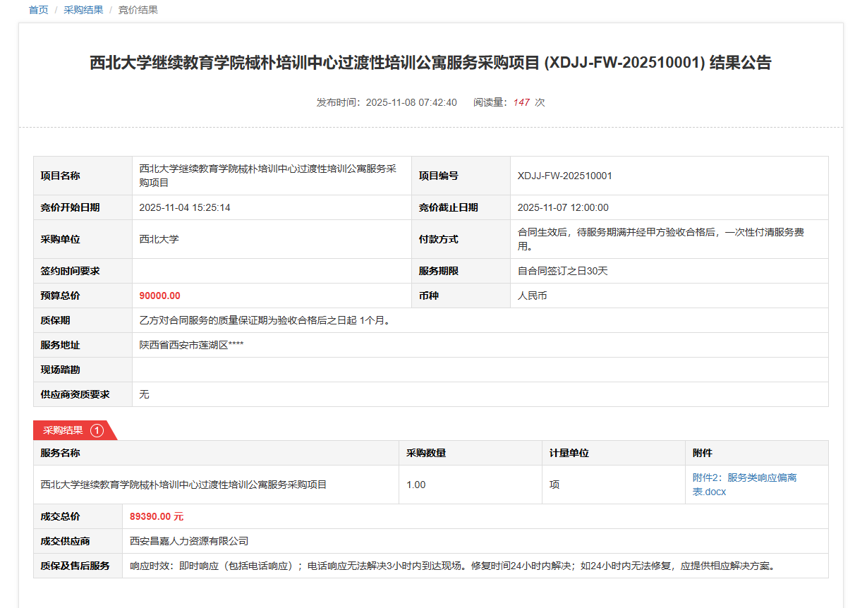 云博app官方在线入口继续教育学院棫朴培训中心过渡性培训公寓服务采购项目(XDJJ-FW-202510001)竞价结果公告