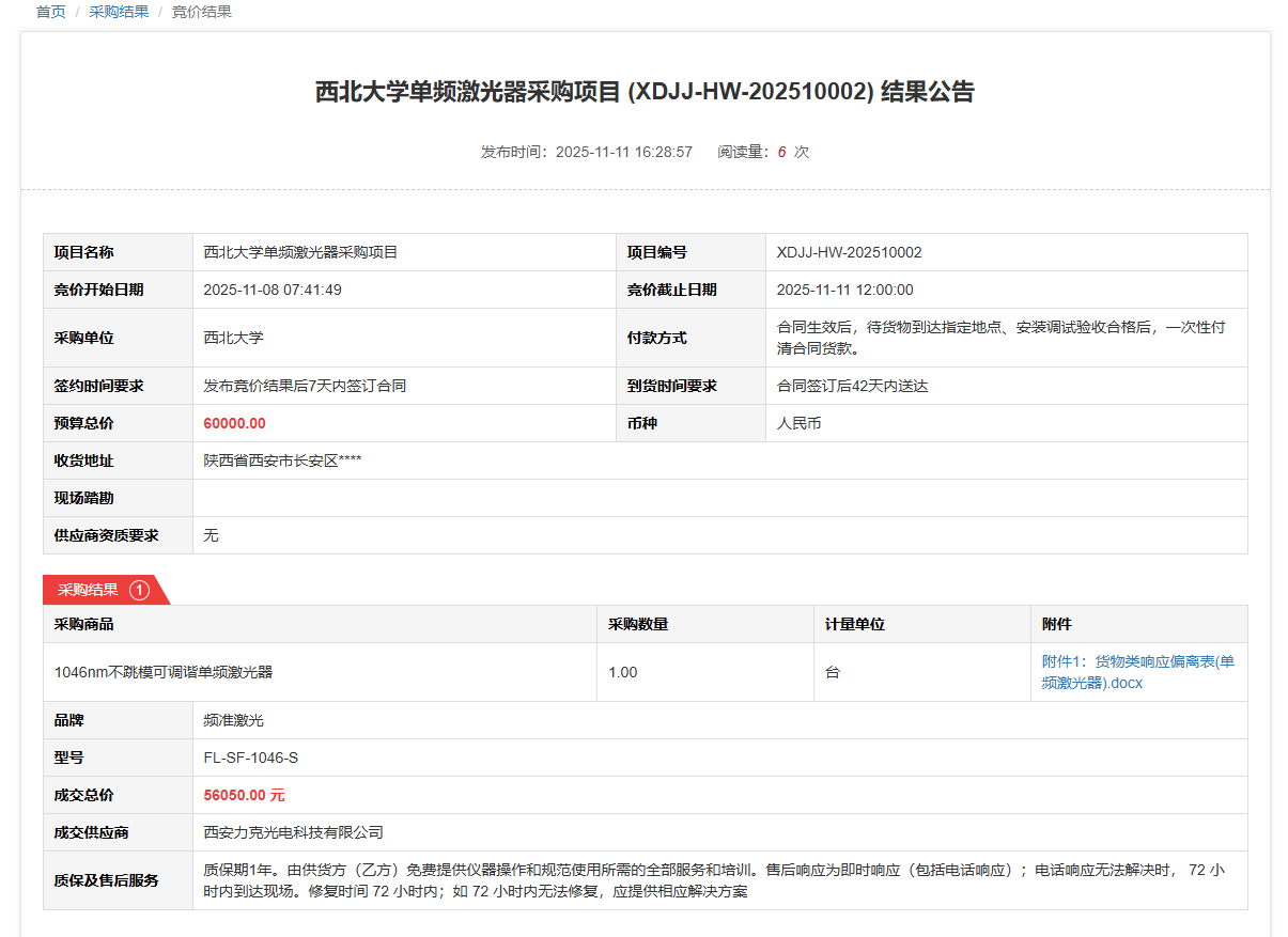 云博app官方在线入口单频激光器采购项目(XDJJ-HW-202510002)竞价结果公告