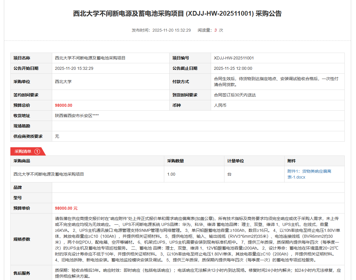云博app官方在线入口不间断电源及蓄电池采购项目(XDJJ-HW-202511001)竞价采购公告