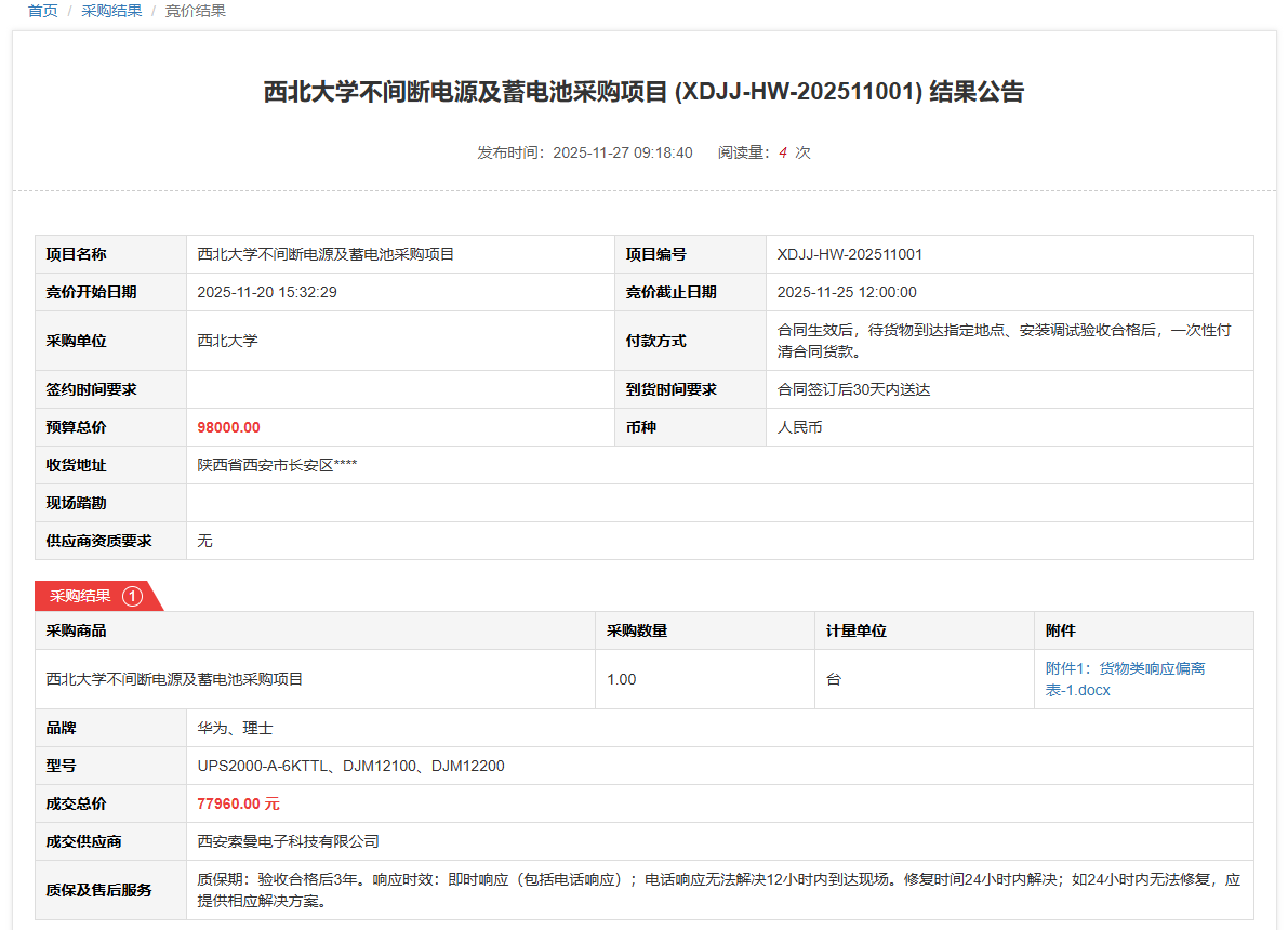 云博app官方在线入口不间断电源及蓄电池采购项目(XDJJ-HW-202511001)竞价结果公告