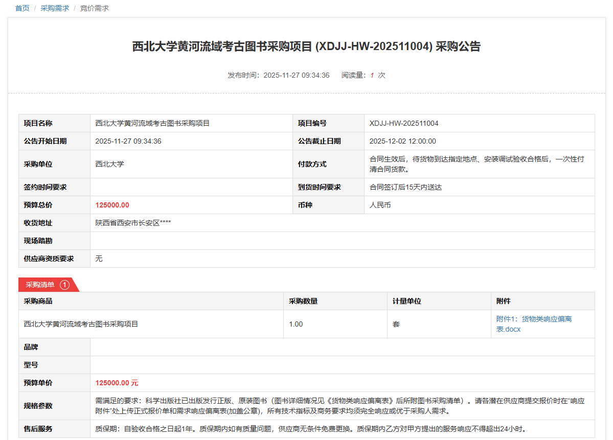 云博app官方在线入口黄河流域考古图书采购项目(XDJJ-HW-202511004)竞价采购公告