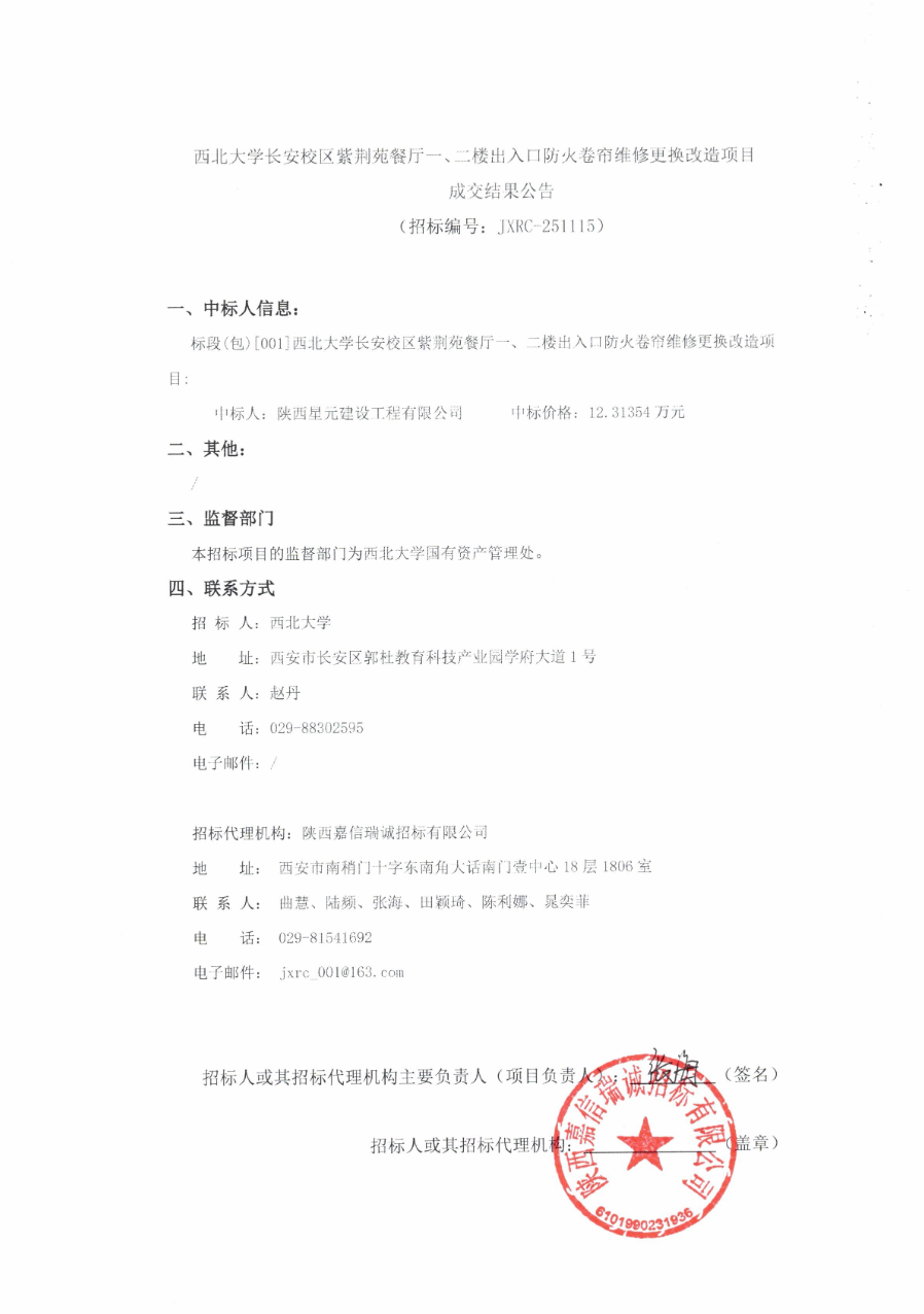 云博app官方在线入口长安校区紫荆苑餐厅一、二楼出入口防火卷帘维修更换改造项目成交结果公告