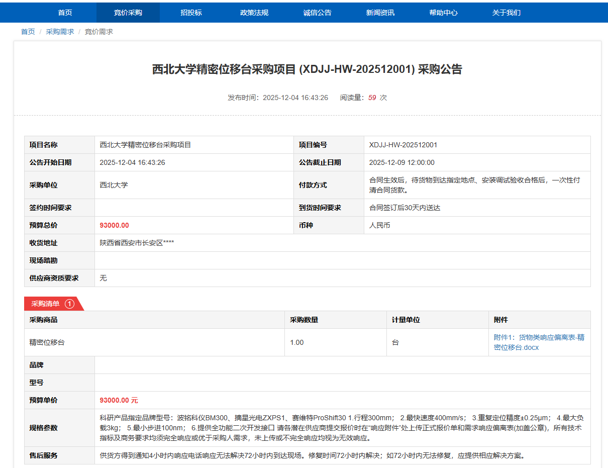 云博app官方在线入口精密位移台采购项目(XDJJ-HW-202512001)竞价采购公告