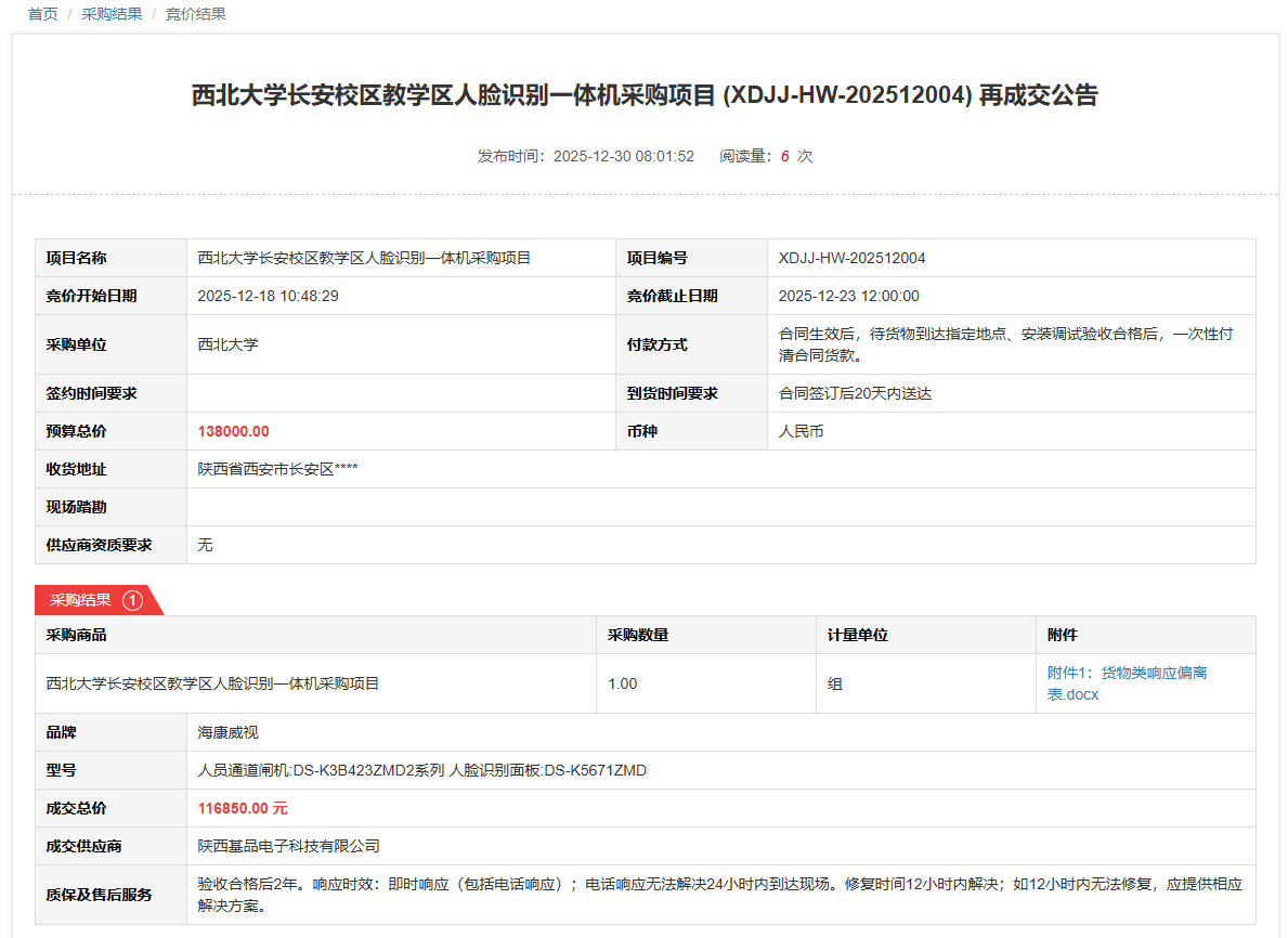 云博app官方在线入口长安校区教学区人脸识别一体机采购项目(XDJJ-HW-202512004)竞价再成交公告