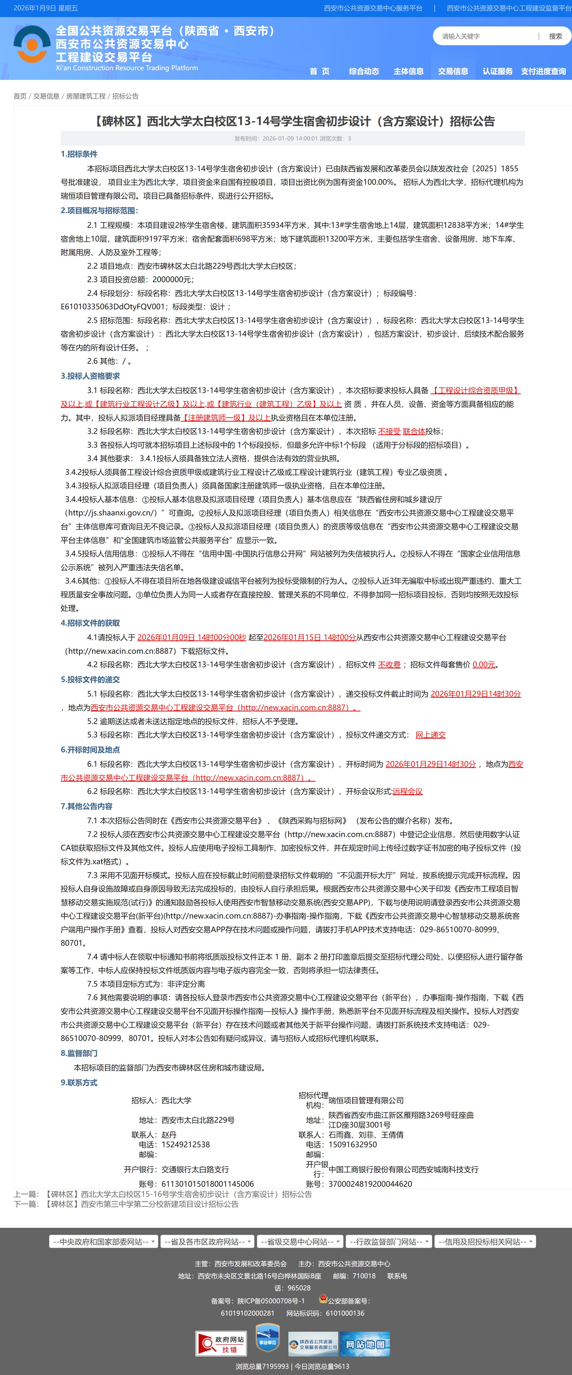 【碑林区】云博app官方在线入口太白校区13-14号学生宿舍初步设计(含方案设计)招标公告
