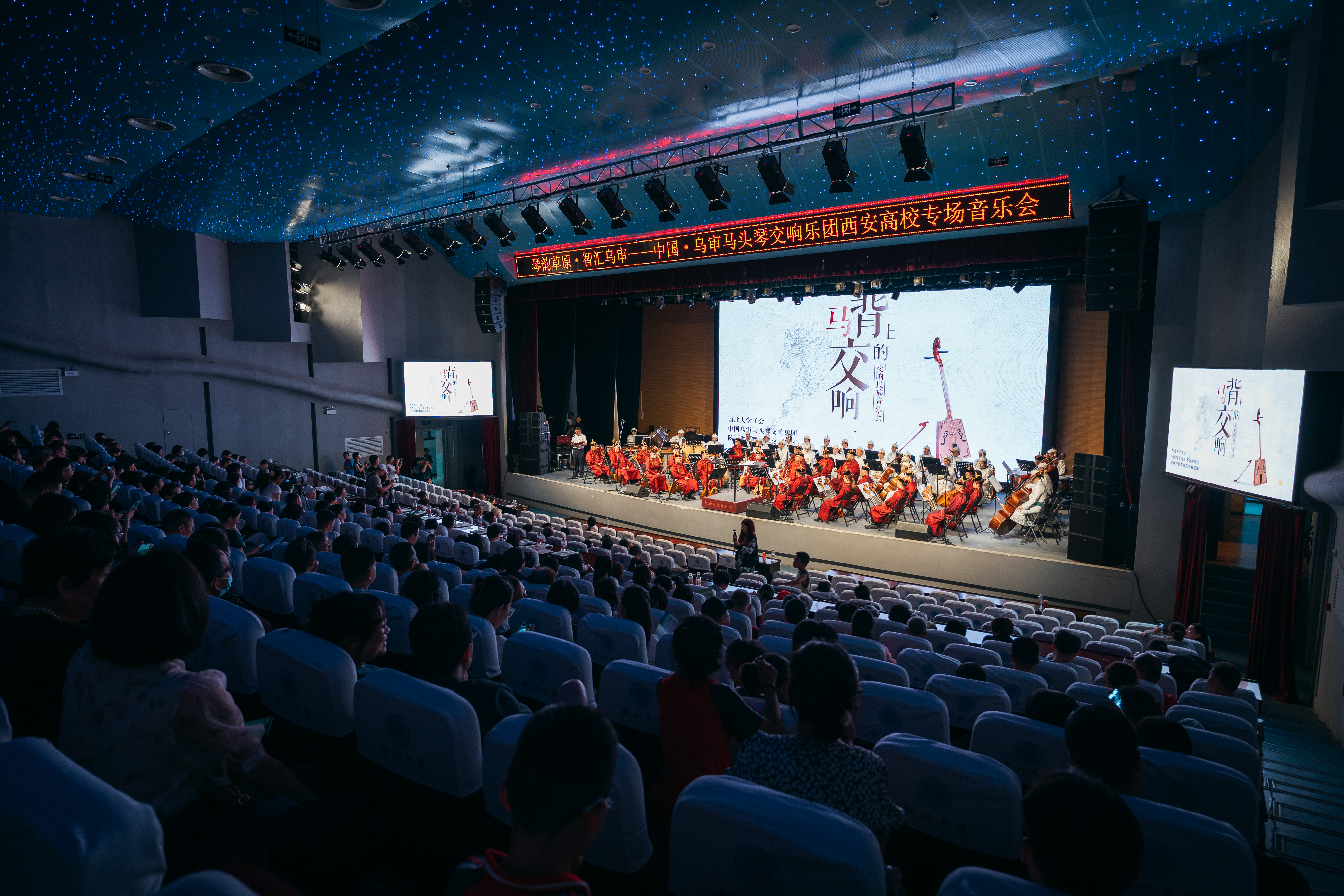 6月11日晚,“琴韵草原·智汇乌审”《马背上的交响》民族音乐会在云博app官方在线入口长安校区上演。本场音乐会由中国·乌审马头琴交响乐团携手陕西省歌舞剧院交响乐团联袂呈现,演出指挥和乐团首席分别由严松波、孟克担任。乌审旗委常委、组织部部长韩玉峰,乌审旗文化和旅游局党组书记、局长张军,乌审旗人才发展中心主任张振江,云博app官方在线入口党委副书记赵作纽以及500多名师生聆听音乐会。