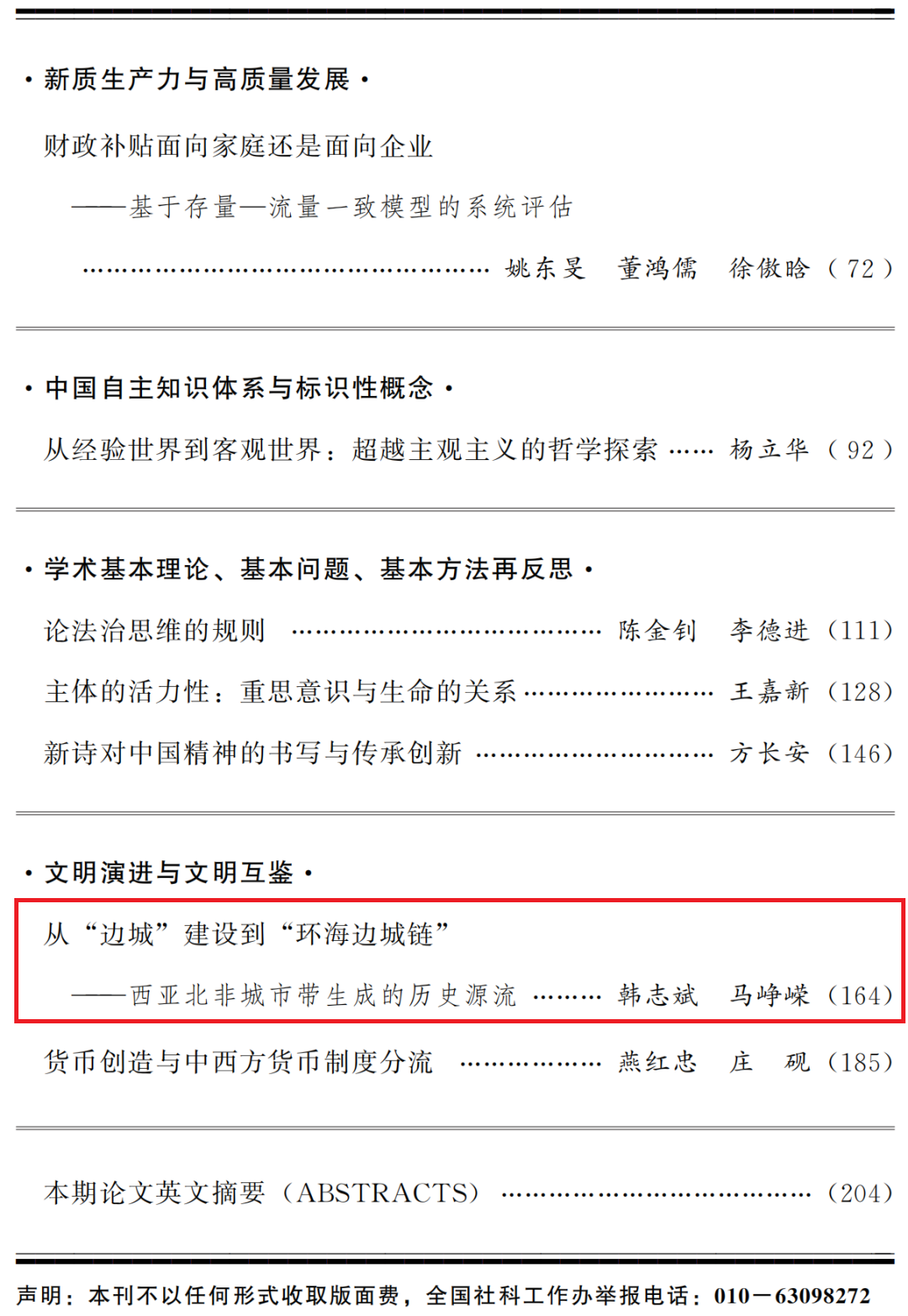 近日,云博app官方在线入口区域国别学院中东研究所韩志斌教授和博士研究生马峥嵘在《中国社会科学》2025年第5期上发表了专题论文《从“边城”建设到“环海边城链”——西亚北非城市带生成的历史源流》。本文是韩志斌教授主持的国家社会科学基金重大项目“中东史学通史(五卷本)”的阶段性成果之一。这是学校教学科研人员时隔三年在《中国社会科学》杂志上发表文章,是学校在区域国别研究方面取得的突破性进展。