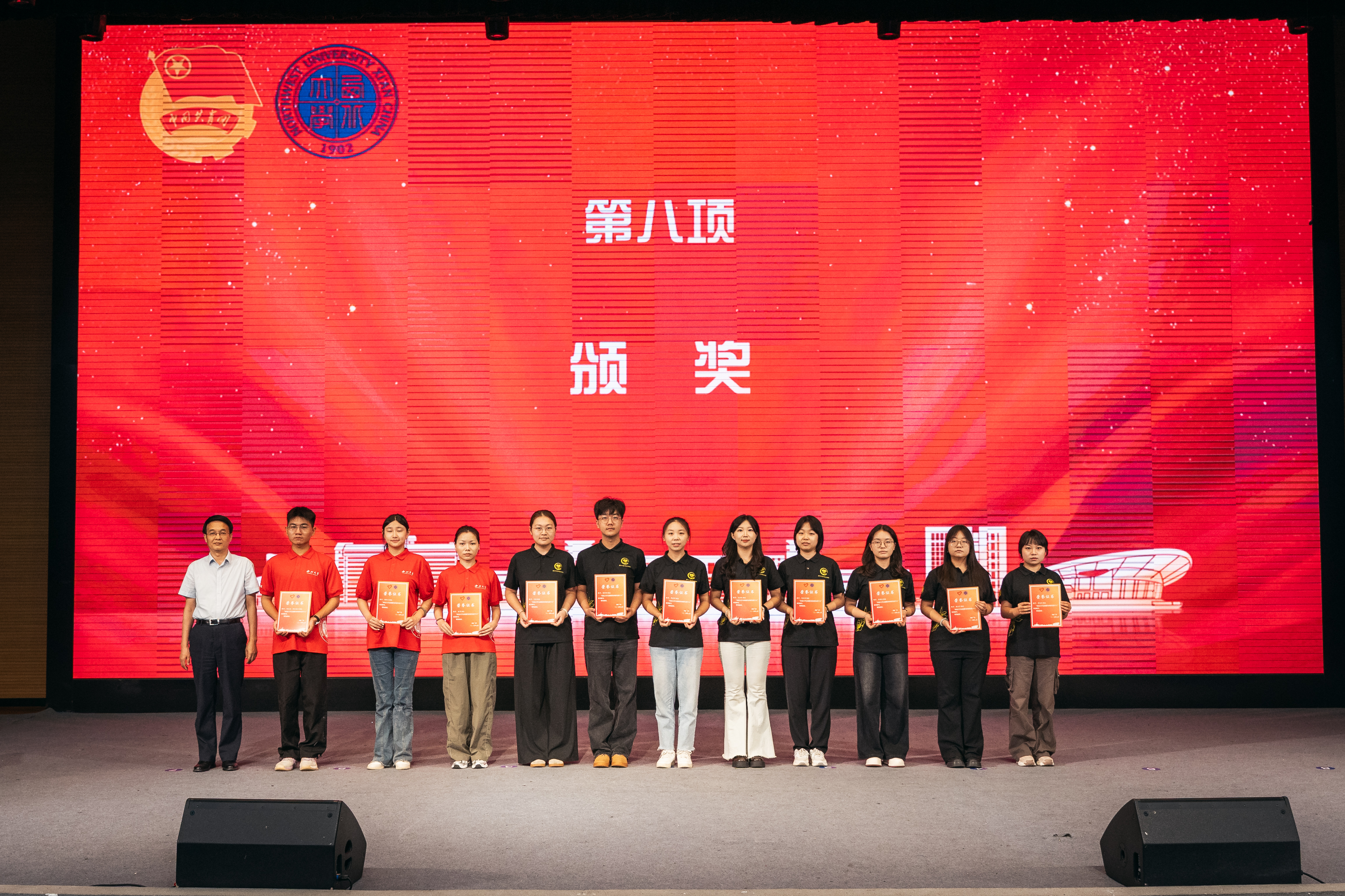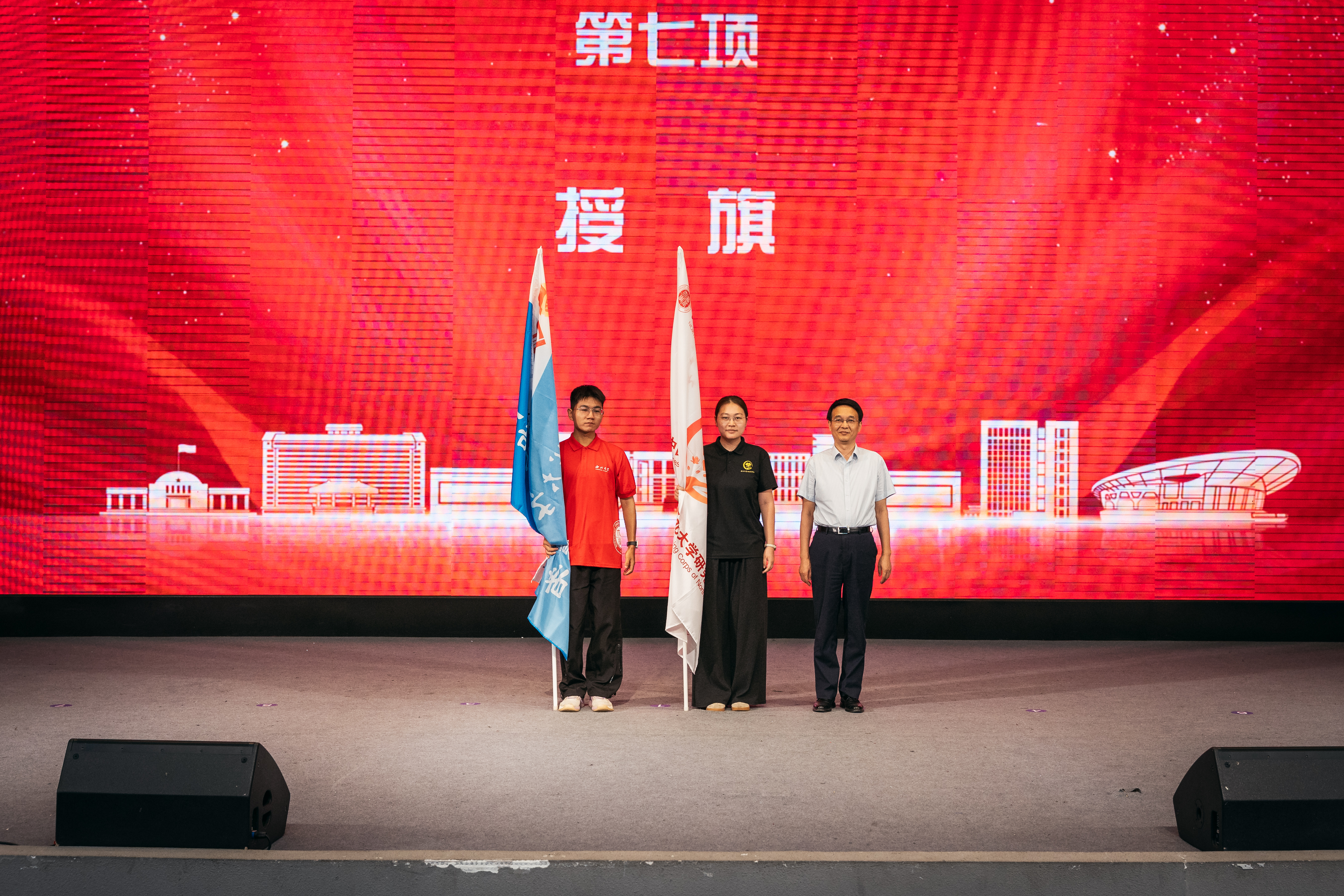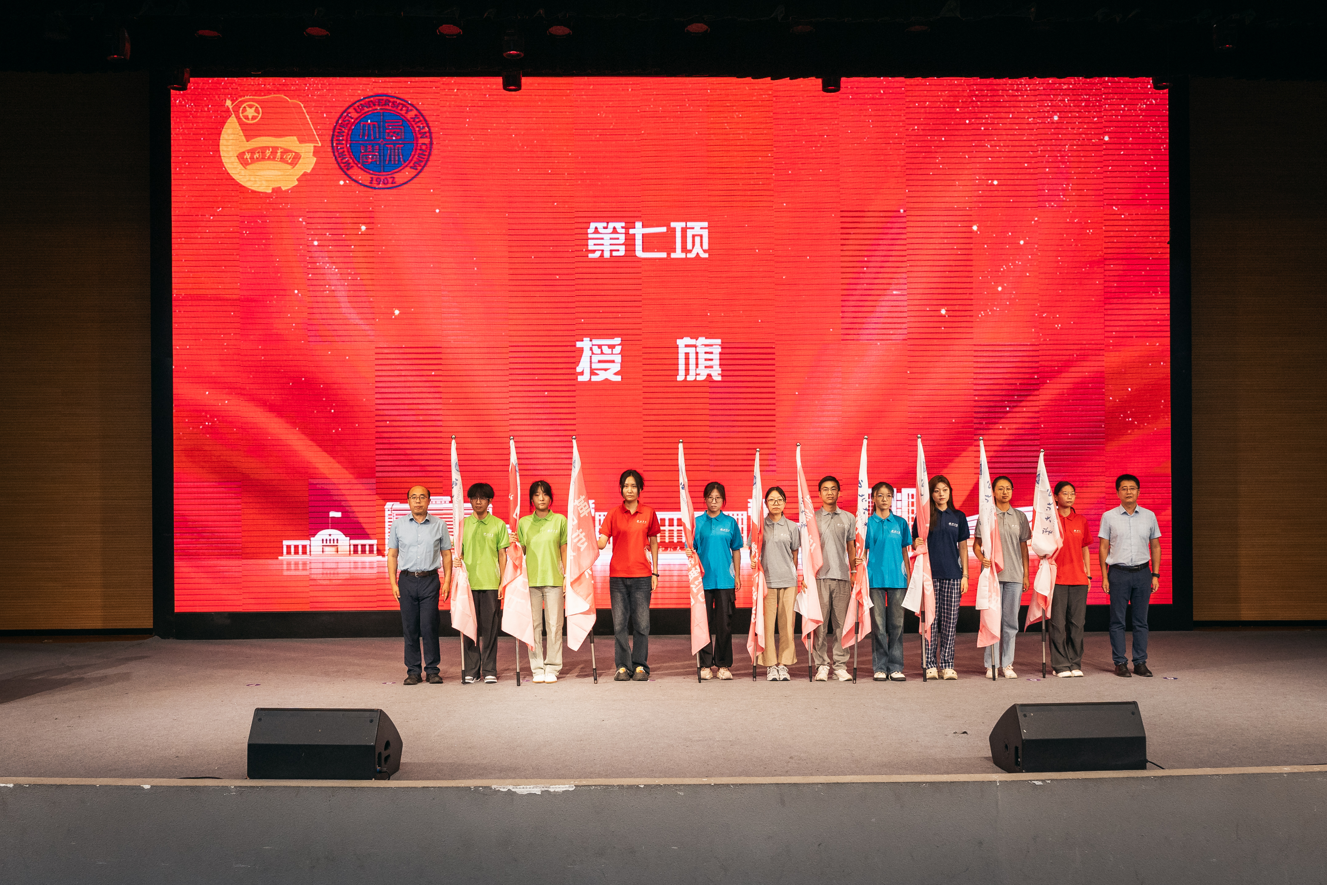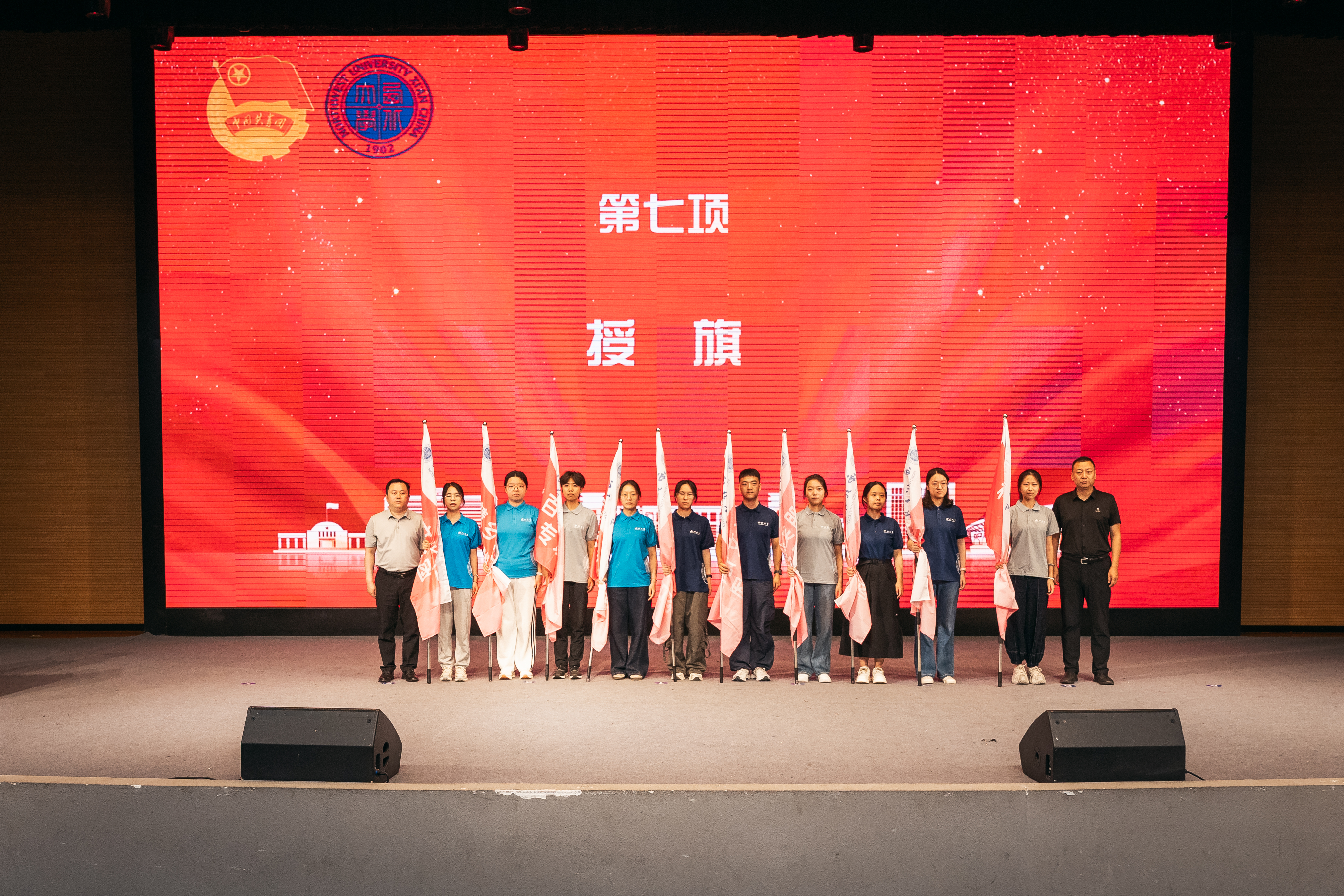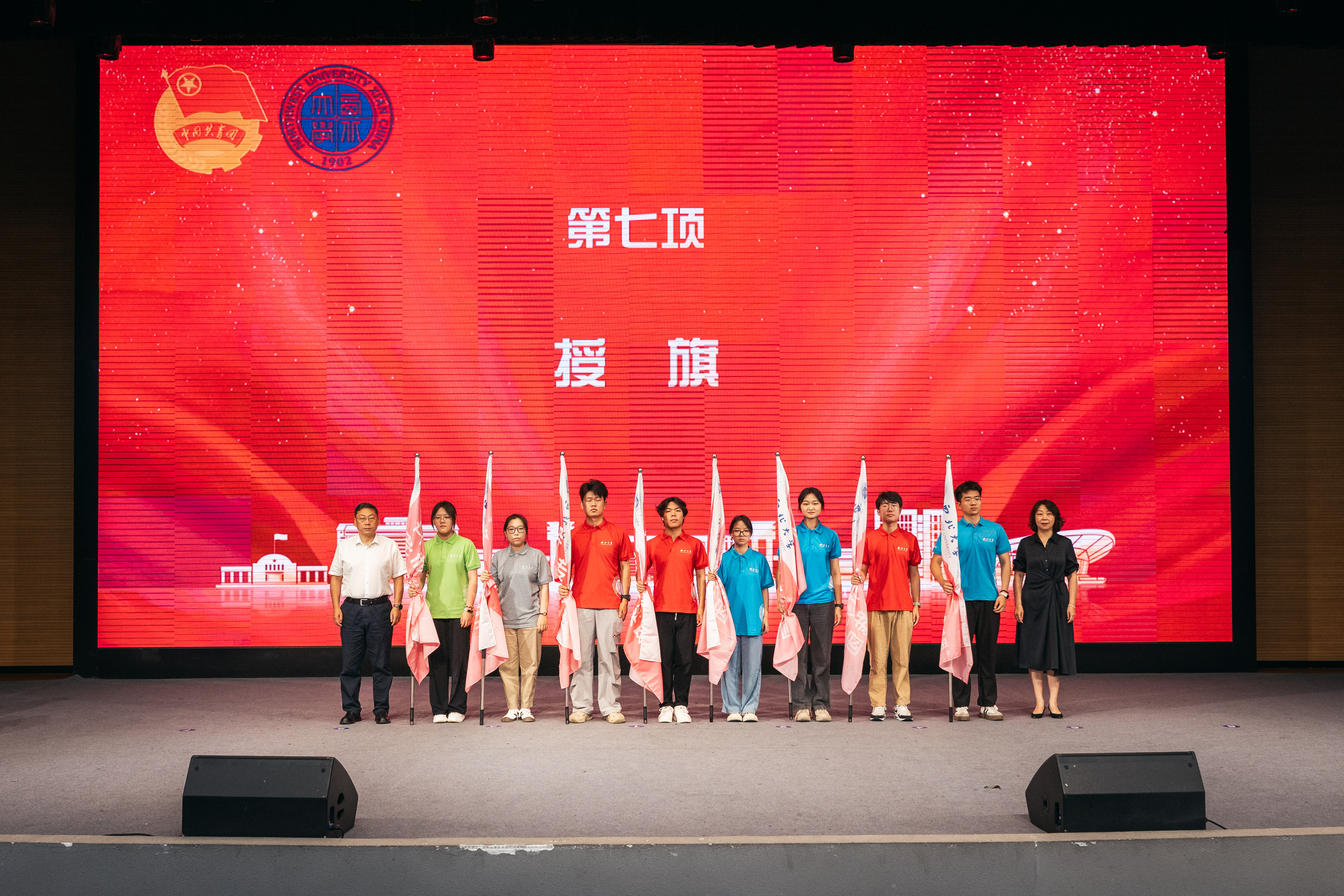 文化遗产学院本科生张艺彤、信息科学与技术学院专职团干部贤悦、公共管理学院毕业生张立宇等三人代表暑期社会实践团队学生、带队教师、西部计划志愿者发言。与会领导为暑期社会实践7个专项团队代表授旗,张远军为2025年西部计划志愿者代表和研究生支教团志愿者代表授旗、颁发荣誉证书。