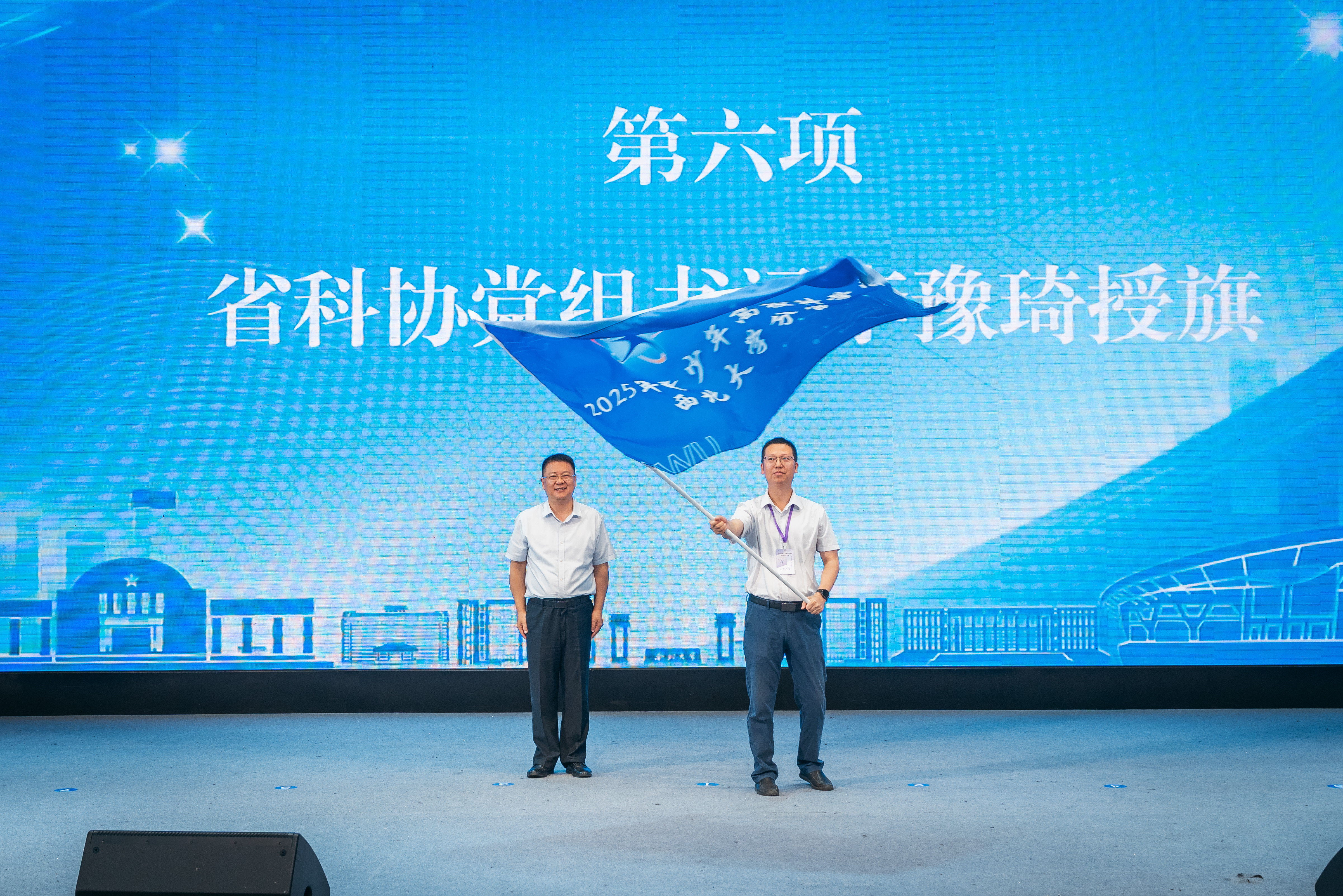 李豫琦为陕西省青少年高校科学营云博app官方在线入口分营授旗,校团委负责人接旗。