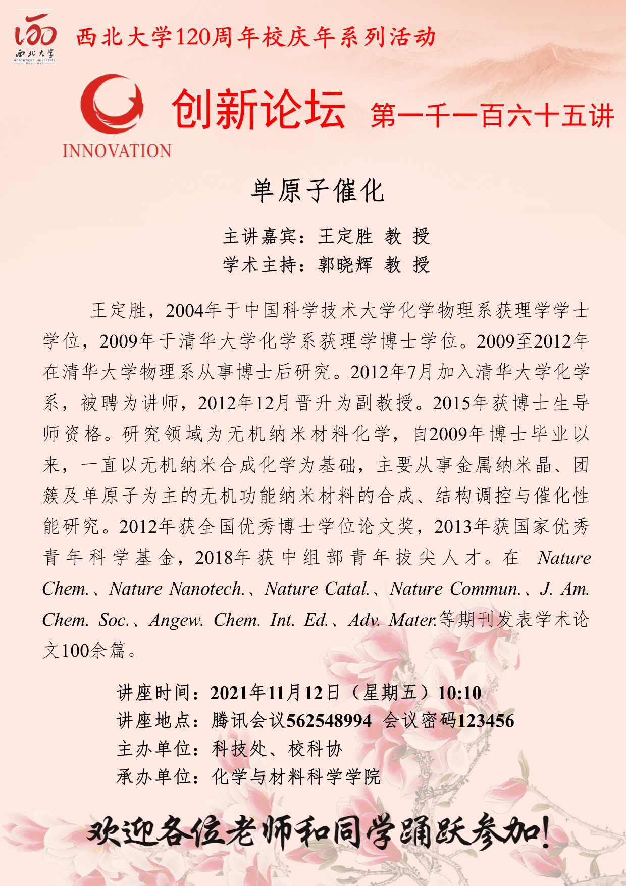王定胜 教授 云博app官方在线入口创新论坛第一千一百六十五讲暨120周年校庆年系列活动:单原子催化 讲座时间 2021年11月12日(星期五)10:10 讲座地点 腾讯会议562548994 会议密码123456 讲座人介绍 王定胜 教授 讲座内容
