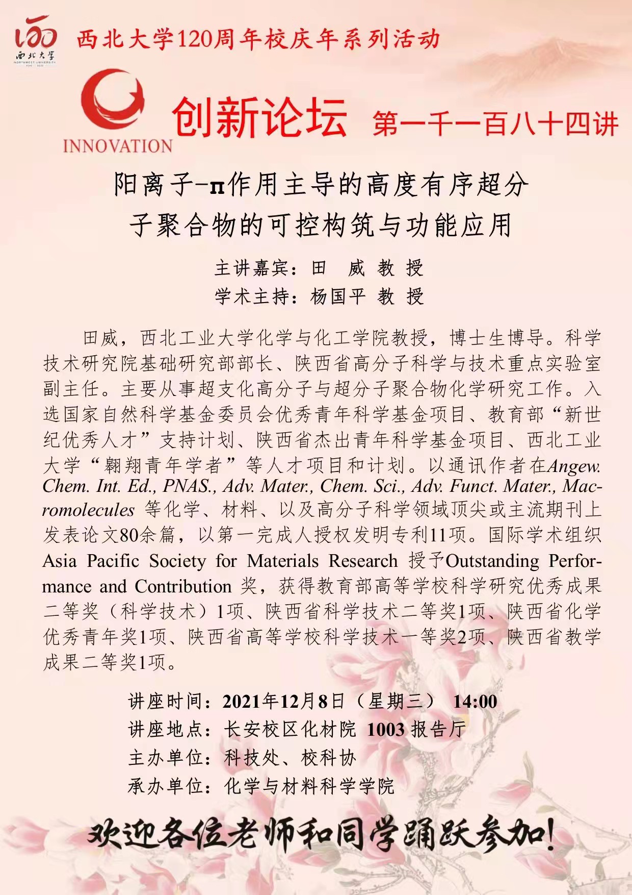 田威 教授 云博app官方在线入口创新论坛第一千一百八十四讲暨120周年校庆年系列活动:阳离子-π作用主导的高度有序超分子聚合物的可控构筑与功能应用 讲座时间 2021年12月8日(星期三) 14:00 讲座地点 长安校区化材院 1003 报告厅 讲座人介绍 田威 教授 讲座内容