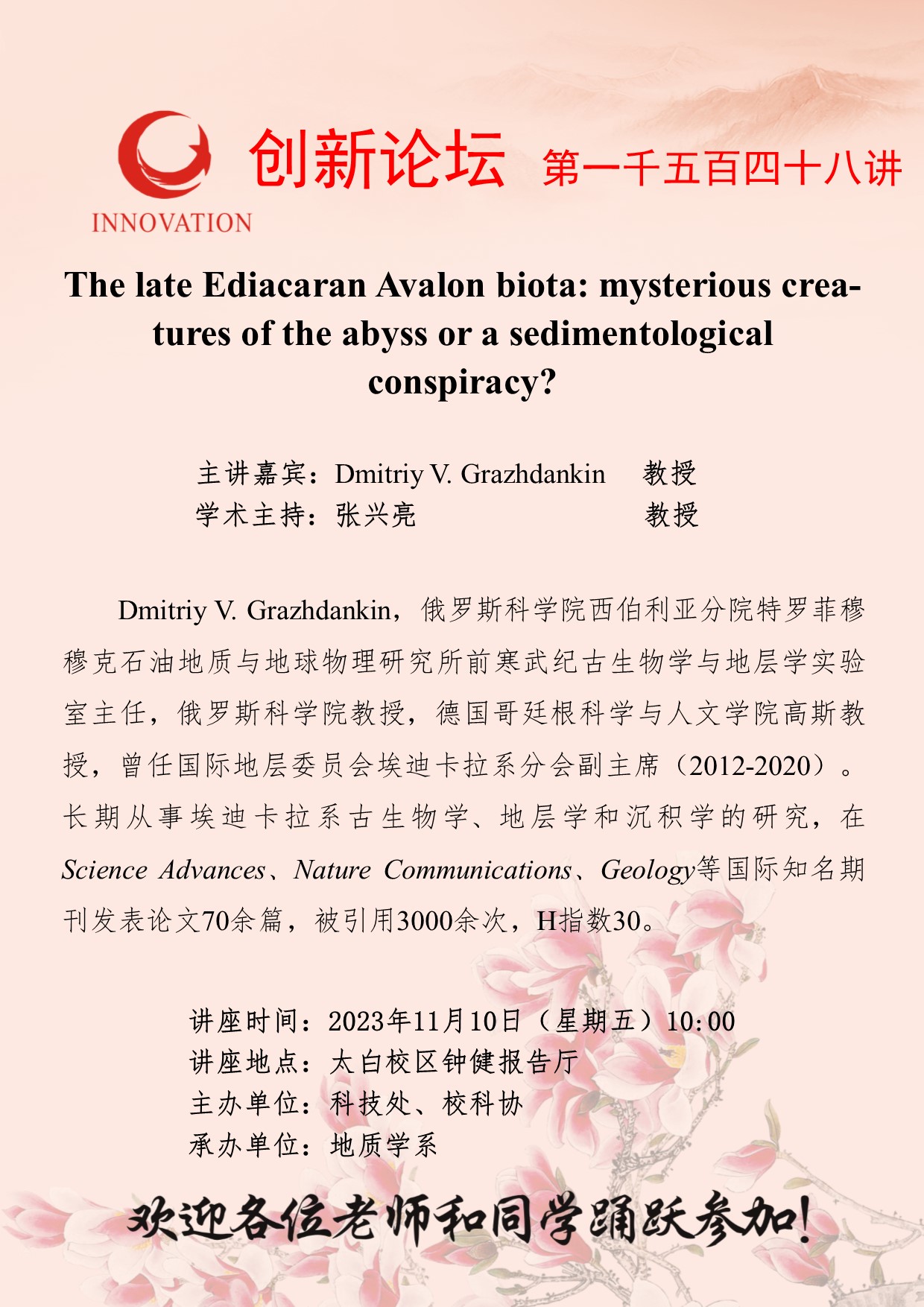 Dmitriy V. Grazhdankin 教授 云博app官方在线入口创新论坛第一千五百四十八讲:The late Ediacaran Avalon biota: mysterious creatures of the abyss or a sedimentological conspiracy? 讲座时间 2023年11月10日(星期五)10:00 讲座地点 太白校区钟健报告厅 讲座人介绍 Dmitriy V. Grazhdankin 教授 讲座内容