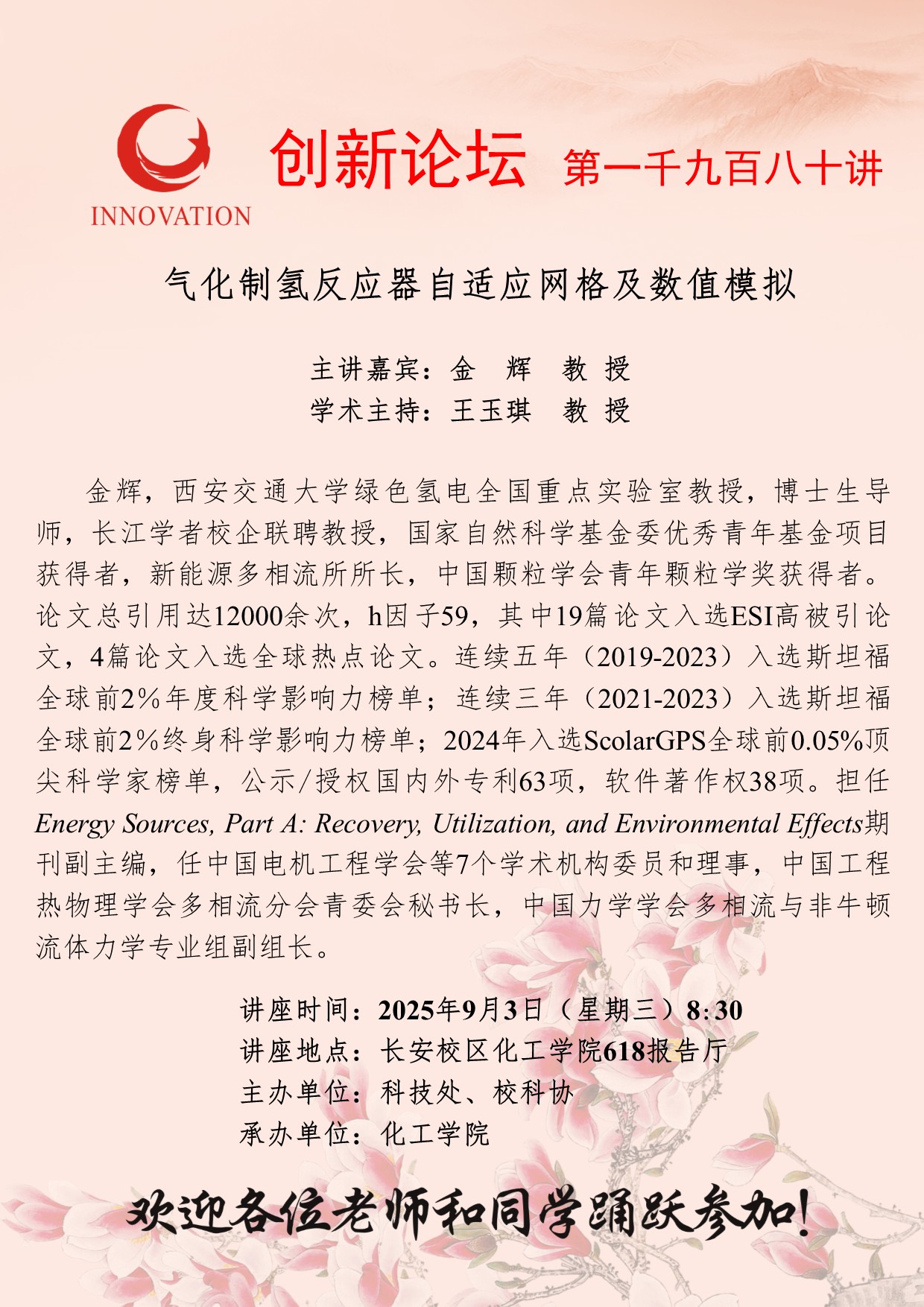 金辉 教授 云博app官方在线入口创新论坛第一千九百八十讲:气化制氢反应器自适应网格及数值模拟 讲座时间 2025年9月3日(星期三)8:30 讲座地点 长安校区化工学院618报告厅 讲座人介绍 金辉 教授 讲座内容